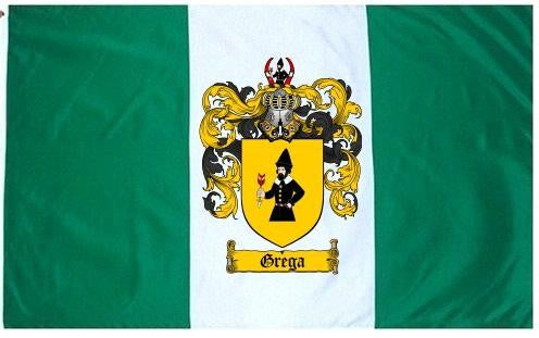 Grega Family Crest Flag / Coat of Arms Flag. You will receive a high quality 3' x 5' Polyester flag with two brass grommets. Proudly display your family heritage with this flag, or hang as a banner on a wall. Our flags make great gifts for birthdays, weddings, anniversaries, fathers day, mothers day, groomsmen gifts, and any other occasion