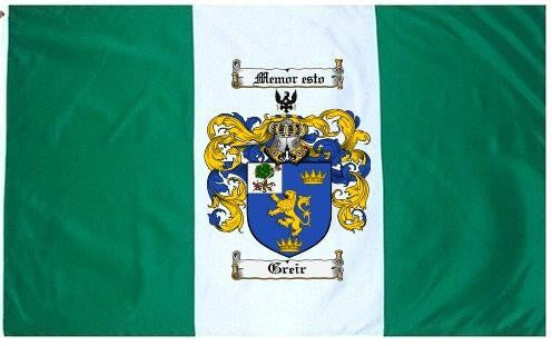 Greir Family Crest Flag / Coat of Arms Flag. You will receive a high quality 3' x 5' Polyester flag with two brass grommets. Proudly display your family heritage with this flag, or hang as a banner on a wall. Our flags make great gifts for birthdays, weddings, anniversaries, fathers day, mothers day, groomsmen gifts, and any other occasion