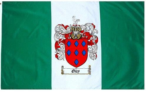 Guy Family Crest Flag / Coat of Arms Flag. You will receive a high quality 3' x 5' Polyester flag with two brass grommets. Proudly display your family heritage with this flag, or hang as a banner on a wall. Our flags make great gifts for birthdays, weddings, anniversaries, fathers day, mothers day, groomsmen gifts, and any other occasion