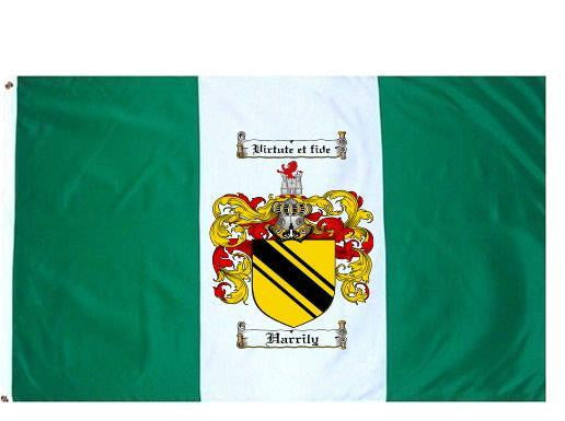 Harrily Family Crest Flag / Coat of Arms Flag. You will receive a high quality 3' x 5' Polyester flag with two brass grommets. Proudly display your family heritage with this flag, or hang as a banner on a wall. Our flags make great gifts for birthdays, weddings, anniversaries, fathers day, mothers day, groomsmen gifts, and any other occasion