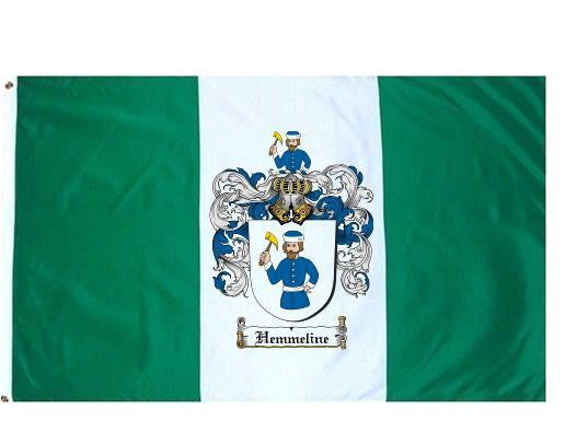 Hemmeline Family Crest Flag / Coat of Arms Flag. You will receive a high quality 3' x 5' Polyester flag with two brass grommets. Proudly display your family heritage with this flag, or hang as a banner on a wall. Our flags make great gifts for birthdays, weddings, anniversaries, fathers day, mothers day, groomsmen gifts, and any other occasion