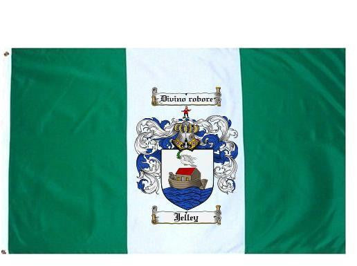 Jelley Family Crest Flag / Coat of Arms Flag. You will receive a high quality 3' x 5' Polyester flag with two brass grommets. Proudly display your family heritage with this flag, or hang as a banner on a wall. Our flags make great gifts for birthdays, weddings, anniversaries, fathers day, mothers day, groomsmen gifts, and any other occasion
