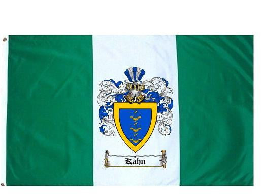 Kahn Family Crest Flag / Coat of Arms Flag. You will receive a high quality 3' x 5' Polyester flag with two brass grommets. Proudly display your family heritage with this flag, or hang as a banner on a wall. Our flags make great gifts for birthdays, weddings, anniversaries, fathers day, mothers day, groomsmen gifts, and any other occasion