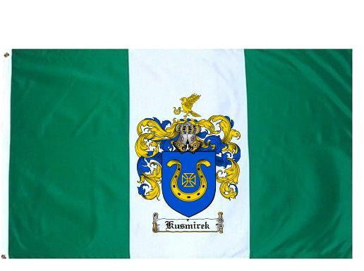 Kusmirek Family Crest Flag / Coat of Arms Flag. You will receive a high quality 3' x 5' Polyester flag with two brass grommets. Proudly display your family heritage with this flag, or hang as a banner on a wall. Our flags make great gifts for birthdays, weddings, anniversaries, fathers day, mothers day, groomsmen gifts, and any other occasion