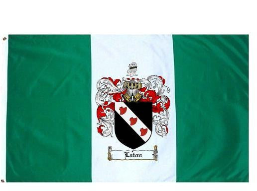 Laton Family Crest Flag / Coat of Arms Flag. You will receive a high quality 3' x 5' Polyester flag with two brass grommets. Proudly display your family heritage with this flag, or hang as a banner on a wall. Our flags make great gifts for birthdays, weddings, anniversaries, fathers day, mothers day, groomsmen gifts, and any other occasion