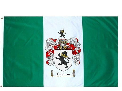 Lincorne Family Crest Flag / Coat of Arms Flag. You will receive a high quality 3' x 5' Polyester flag with two brass grommets. Proudly display your family heritage with this flag, or hang as a banner on a wall. Our flags make great gifts for birthdays, weddings, anniversaries, fathers day, mothers day, groomsmen gifts, and any other occasion