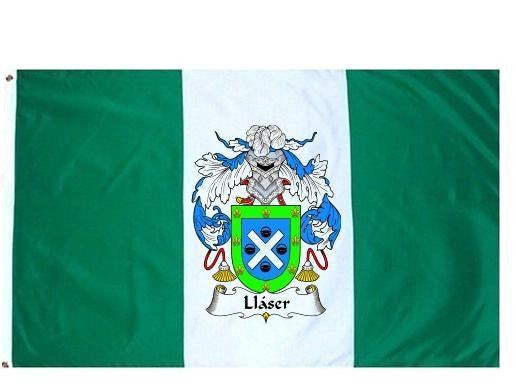 Llaser Family Crest Flag / Coat of Arms Flag. You will receive a high quality 3' x 5' Polyester flag with two brass grommets. Proudly display your family heritage with this flag, or hang as a banner on a wall. Our flags make great gifts for birthdays, weddings, anniversaries, fathers day, mothers day, groomsmen gifts, and any other occasion