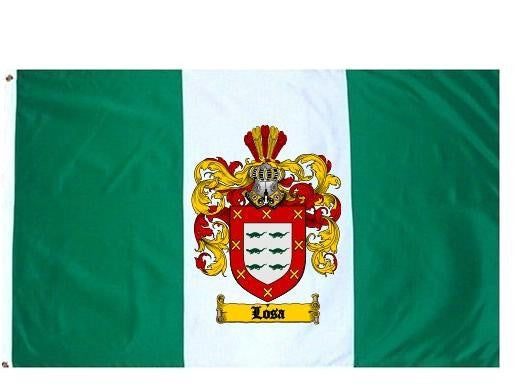 Losa Family Crest Flag / Coat of Arms Flag. You will receive a high quality 3' x 5' Polyester flag with two brass grommets. Proudly display your family heritage with this flag, or hang as a banner on a wall. Our flags make great gifts for birthdays, weddings, anniversaries, fathers day, mothers day, groomsmen gifts, and any other occasion