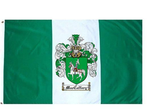 Maccaffery Family Crest Flag / Coat of Arms Flag. You will receive a high quality 3' x 5' Polyester flag with two brass grommets. Proudly display your family heritage with this flag, or hang as a banner on a wall. Our flags make great gifts for birthdays, weddings, anniversaries, fathers day, mothers day, groomsmen gifts, and any other occasion