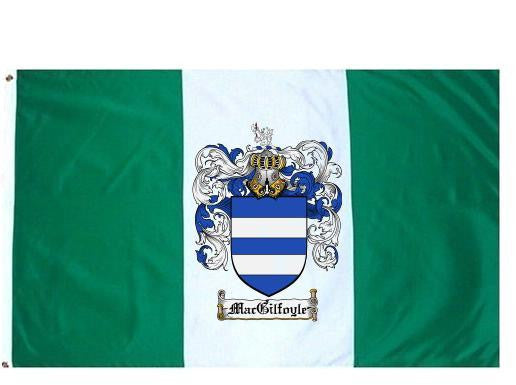 Macgilfoyle Family Crest Flag / Coat of Arms Flag. You will receive a high quality 3' x 5' Polyester flag with two brass grommets. Proudly display your family heritage with this flag, or hang as a banner on a wall. Our flags make great gifts for birthdays, weddings, anniversaries, fathers day, mothers day, groomsmen gifts, and any other occasion