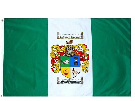 Mackinning Family Crest Flag / Coat of Arms Flag. You will receive a high quality 3' x 5' Polyester flag with two brass grommets. Proudly display your family heritage with this flag, or hang as a banner on a wall. Our flags make great gifts for birthdays, weddings, anniversaries, fathers day, mothers day, groomsmen gifts, and any other occasion