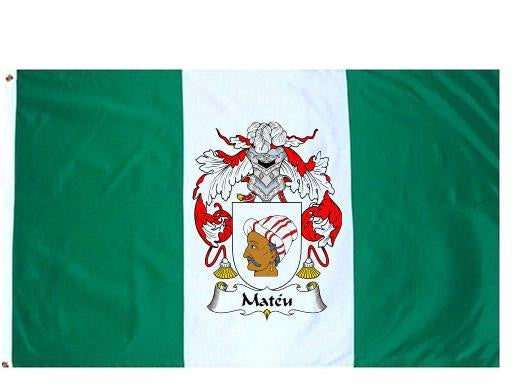 Mateu Family Crest Flag / Coat of Arms Flag. You will receive a high quality 3' x 5' Polyester flag with two brass grommets. Proudly display your family heritage with this flag, or hang as a banner on a wall. Our flags make great gifts for birthdays, weddings, anniversaries, fathers day, mothers day, groomsmen gifts, and any other occasion