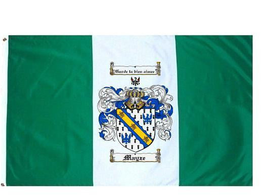Mayze Family Crest Flag / Coat of Arms Flag. You will receive a high quality 3' x 5' Polyester flag with two brass grommets. Proudly display your family heritage with this flag, or hang as a banner on a wall. Our flags make great gifts for birthdays, weddings, anniversaries, fathers day, mothers day, groomsmen gifts, and any other occasion