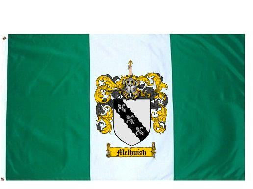 Melhuish Family Crest Flag / Coat of Arms Flag. You will receive a high quality 3' x 5' Polyester flag with two brass grommets. Proudly display your family heritage with this flag, or hang as a banner on a wall. Our flags make great gifts for birthdays, weddings, anniversaries, fathers day, mothers day, groomsmen gifts, and any other occasion