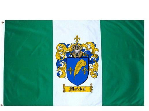Merckel Family Crest Flag / Coat of Arms Flag. You will receive a high quality 3' x 5' Polyester flag with two brass grommets. Proudly display your family heritage with this flag, or hang as a banner on a wall. Our flags make great gifts for birthdays, weddings, anniversaries, fathers day, mothers day, groomsmen gifts, and any other occasion
