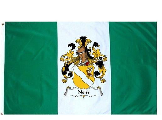 Neiss Family Crest Flag / Coat of Arms Flag. You will receive a high quality 3' x 5' Polyester flag with two brass grommets. Proudly display your family heritage with this flag, or hang as a banner on a wall. Our flags make great gifts for birthdays, weddings, anniversaries, fathers day, mothers day, groomsmen gifts, and any other occasion