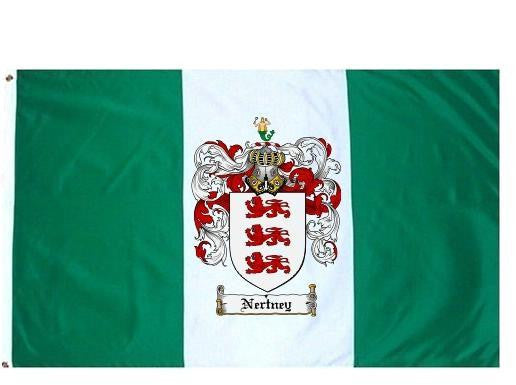 Nertney Family Crest Flag / Coat of Arms Flag. You will receive a high quality 3' x 5' Polyester flag with two brass grommets. Proudly display your family heritage with this flag, or hang as a banner on a wall. Our flags make great gifts for birthdays, weddings, anniversaries, fathers day, mothers day, groomsmen gifts, and any other occasion