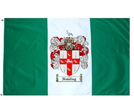 Nowling Family Crest Flag / Coat of Arms Flag. You will receive a high quality 3' x 5' Polyester flag with two brass grommets. Proudly display your family heritage with this flag, or hang as a banner on a wall. Our flags make great gifts for birthdays, weddings, anniversaries, fathers day, mothers day, groomsmen gifts, and any other occasion