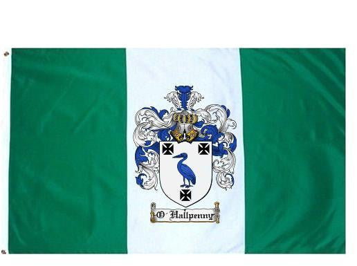 O'Hallpenny Family Crest Flag / Coat of Arms Flag. You will receive a high quality 3' x 5' Polyester flag with two brass grommets. Proudly display your family heritage with this flag, or hang as a banner on a wall. Our flags make great gifts for birthdays, weddings, anniversaries, fathers day, mothers day, groomsmen gifts, and any other occasion