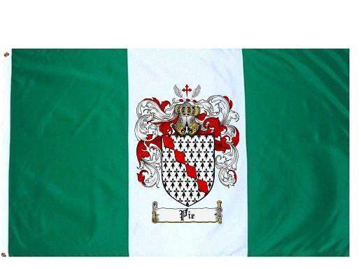 Pie Family Crest Flag / Coat of Arms Flag. You will receive a high quality 3' x 5' Polyester flag with two brass grommets. Proudly display your family heritage with this flag, or hang as a banner on a wall. Our flags make great gifts for birthdays, weddings, anniversaries, fathers day, mothers day, groomsmen gifts, and any other occasion