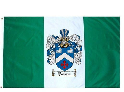 Poleson Family Crest Flag / Coat of Arms Flag. You will receive a high quality 3' x 5' Polyester flag with two brass grommets. Proudly display your family heritage with this flag, or hang as a banner on a wall. Our flags make great gifts for birthdays, weddings, anniversaries, fathers day, mothers day, groomsmen gifts, and any other occasion