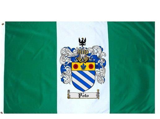 Poto Family Crest Flag / Coat of Arms Flag. You will receive a high quality 3' x 5' Polyester flag with two brass grommets. Proudly display your family heritage with this flag, or hang as a banner on a wall. Our flags make great gifts for birthdays, weddings, anniversaries, fathers day, mothers day, groomsmen gifts, and any other occasion