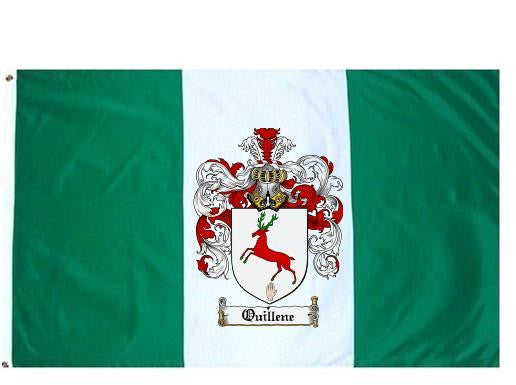 Quillene Family Crest Flag / Coat of Arms Flag. You will receive a high quality 3' x 5' Polyester flag with two brass grommets. Proudly display your family heritage with this flag, or hang as a banner on a wall. Our flags make great gifts for birthdays, weddings, anniversaries, fathers day, mothers day, groomsmen gifts, and any other occasion