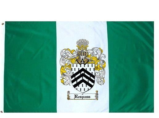 Respass Family Crest Flag / Coat of Arms Flag. You will receive a high quality 3' x 5' Polyester flag with two brass grommets. Proudly display your family heritage with this flag, or hang as a banner on a wall. Our flags make great gifts for birthdays, weddings, anniversaries, fathers day, mothers day, groomsmen gifts, and any other occasion