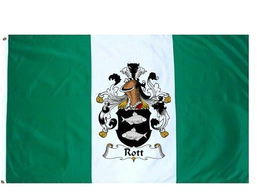Rott Family Crest Flag / Coat of Arms Flag. You will receive a high quality 3' x 5' Polyester flag with two brass grommets. Proudly display your family heritage with this flag, or hang as a banner on a wall. Our flags make great gifts for birthdays, weddings, anniversaries, fathers day, mothers day, groomsmen gifts, and any other occasion
