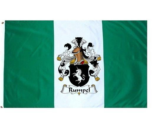Rumpel Family Crest Flag / Coat of Arms Flag. You will receive a high quality 3' x 5' Polyester flag with two brass grommets. Proudly display your family heritage with this flag, or hang as a banner on a wall. Our flags make great gifts for birthdays, weddings, anniversaries, fathers day, mothers day, groomsmen gifts, and any other occasion