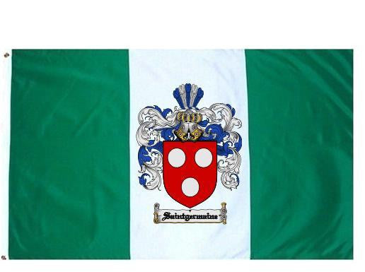 Saintgermaine Family Crest Flag / Coat of Arms Flag. You will receive a high quality 3' x 5' Polyester flag with two brass grommets. Proudly display your family heritage with this flag, or hang as a banner on a wall. Our flags make great gifts for birthdays, weddings, anniversaries, fathers day, mothers day, groomsmen gifts, and any other occasion