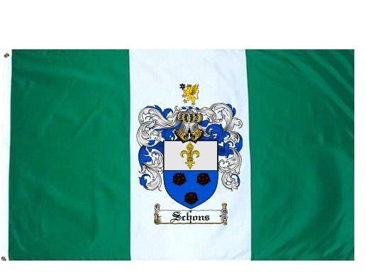 Schons Family Crest Flag / Coat of Arms Flag. You will receive a high quality 3' x 5' Polyester flag with two brass grommets. Proudly display your family heritage with this flag, or hang as a banner on a wall. Our flags make great gifts for birthdays, weddings, anniversaries, fathers day, mothers day, groomsmen gifts, and any other occasion