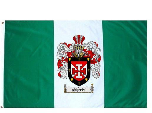 Sheets Family Crest Flag / Coat of Arms Flag. You will receive a high quality 3' x 5' Polyester flag with two brass grommets. Proudly display your family heritage with this flag, or hang as a banner on a wall. Our flags make great gifts for birthdays, weddings, anniversaries, fathers day, mothers day, groomsmen gifts, and any other occasion
