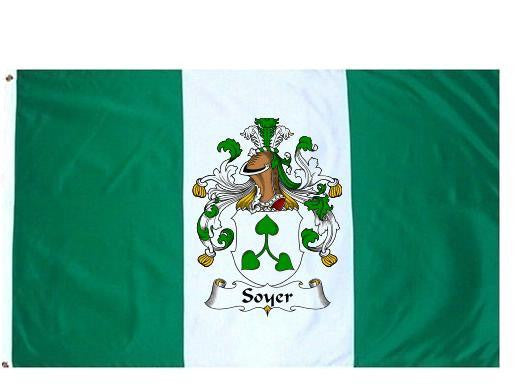 Soyer Family Crest Flag / Coat of Arms Flag. You will receive a high quality 3' x 5' Polyester flag with two brass grommets. Proudly display your family heritage with this flag, or hang as a banner on a wall. Our flags make great gifts for birthdays, weddings, anniversaries, fathers day, mothers day, groomsmen gifts, and any other occasion