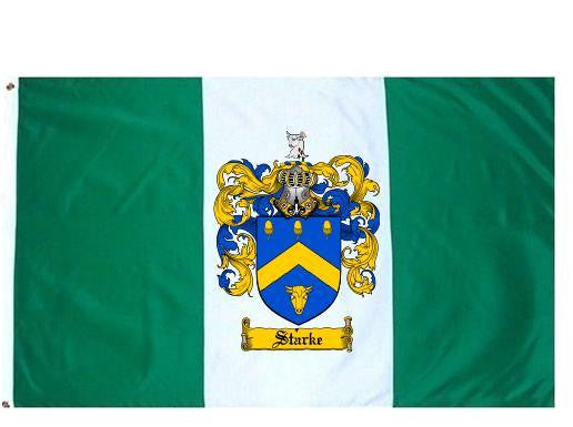 Starke Family Crest Flag / Coat of Arms Flag. You will receive a high quality 3' x 5' Polyester flag with two brass grommets. Proudly display your family heritage with this flag, or hang as a banner on a wall. Our flags make great gifts for birthdays, weddings, anniversaries, fathers day, mothers day, groomsmen gifts, and any other occasion