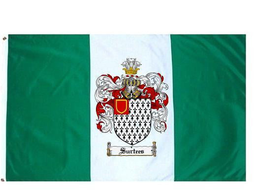Surtees Family Crest Flag / Coat of Arms Flag. You will receive a high quality 3' x 5' Polyester flag with two brass grommets. Proudly display your family heritage with this flag, or hang as a banner on a wall. Our flags make great gifts for birthdays, weddings, anniversaries, fathers day, mothers day, groomsmen gifts, and any other occasion