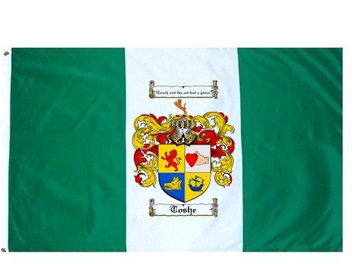 Toshe Family Crest Flag / Coat of Arms Flag. You will receive a high quality 3' x 5' Polyester flag with two brass grommets. Proudly display your family heritage with this flag, or hang as a banner on a wall. Our flags make great gifts for birthdays, weddings, anniversaries, fathers day, mothers day, groomsmen gifts, and any other occasion
