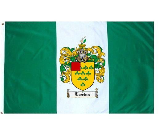 Treeton Family Crest Flag / Coat of Arms Flag. You will receive a high quality 3' x 5' Polyester flag with two brass grommets. Proudly display your family heritage with this flag, or hang as a banner on a wall. Our flags make great gifts for birthdays, weddings, anniversaries, fathers day, mothers day, groomsmen gifts, and any other occasion