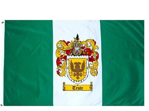 Trute Family Crest Flag / Coat of Arms Flag. You will receive a high quality 3' x 5' Polyester flag with two brass grommets. Proudly display your family heritage with this flag, or hang as a banner on a wall. Our flags make great gifts for birthdays, weddings, anniversaries, fathers day, mothers day, groomsmen gifts, and any other occasion