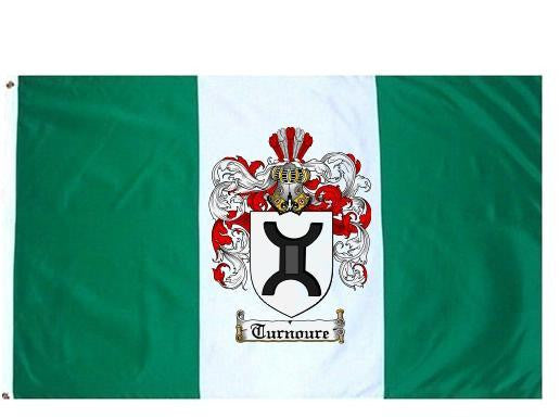 Turnoure Family Crest Flag / Coat of Arms Flag. You will receive a high quality 3' x 5' Polyester flag with two brass grommets. Proudly display your family heritage with this flag, or hang as a banner on a wall. Our flags make great gifts for birthdays, weddings, anniversaries, fathers day, mothers day, groomsmen gifts, and any other occasion