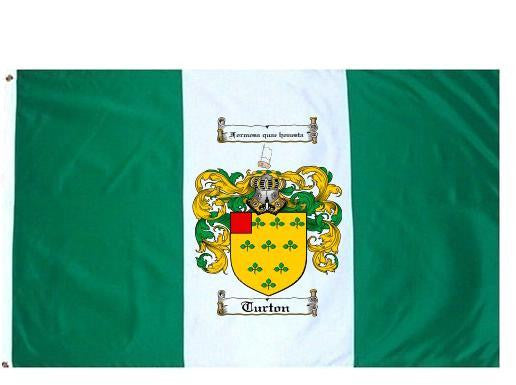 Turton Family Crest Flag / Coat of Arms Flag. You will receive a high quality 3' x 5' Polyester flag with two brass grommets. Proudly display your family heritage with this flag, or hang as a banner on a wall. Our flags make great gifts for birthdays, weddings, anniversaries, fathers day, mothers day, groomsmen gifts, and any other occasion