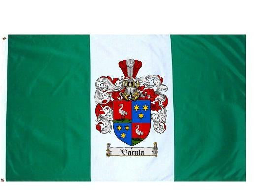 Vacula Family Crest Flag / Coat of Arms Flag. You will receive a high quality 3' x 5' Polyester flag with two brass grommets. Proudly display your family heritage with this flag, or hang as a banner on a wall. Our flags make great gifts for birthdays, weddings, anniversaries, fathers day, mothers day, groomsmen gifts, and any other occasion
