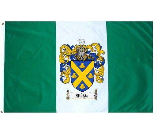 Waide Family Crest Flag / Coat of Arms Flag. You will receive a high quality 3' x 5' Polyester flag with two brass grommets. Proudly display your family heritage with this flag, or hang as a banner on a wall. Our flags make great gifts for birthdays, weddings, anniversaries, fathers day, mothers day, groomsmen gifts, and any other occasion