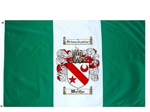 Waitho Family Crest Flag / Coat of Arms Flag. You will receive a high quality 3' x 5' Polyester flag with two brass grommets. Proudly display your family heritage with this flag, or hang as a banner on a wall. Our flags make great gifts for birthdays, weddings, anniversaries, fathers day, mothers day, groomsmen gifts, and any other occasion