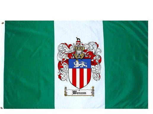 Wenam Family Crest Flag / Coat of Arms Flag. You will receive a high quality 3' x 5' Polyester flag with two brass grommets. Proudly display your family heritage with this flag, or hang as a banner on a wall. Our flags make great gifts for birthdays, weddings, anniversaries, fathers day, mothers day, groomsmen gifts, and any other occasion