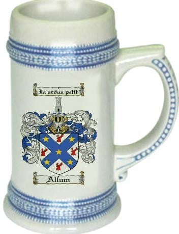 Allum Family Crest Stein / Coat of Arms Beer Tankard. We believe our Coat of Arms Steins are of the highest quality anywhere. The glassware quality is very thick and sturdy. The stein feels great in your hand with a very thick handle. Fill this glass with your favorite beer or beverage. keywords: steins, beer, german, glass, glassware, cup, tankard, goblet, family shields, shield, family, genealogy, heraldry, code of arms