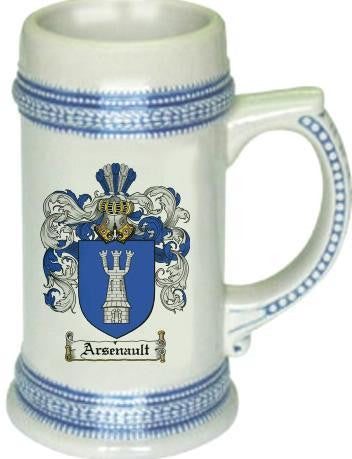 Arsenault Family Crest Stein / Coat of Arms Beer Tankard. We believe our Coat of Arms Steins are of the highest quality anywhere. The glassware quality is very thick and sturdy. The stein feels great in your hand with a very thick handle. Fill this glass with your favorite beer or beverage. keywords: steins, beer, german, glass, glassware, cup, tankard, goblet, family shields, shield, family, genealogy, heraldry, code of arms