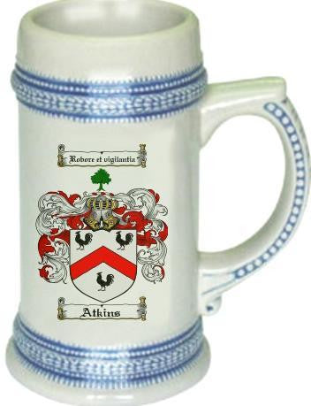 Atkins Family Crest Stein / Coat of Arms Beer Tankard. We believe our Coat of Arms Steins are of the highest quality anywhere. The glassware quality is very thick and sturdy. The stein feels great in your hand with a very thick handle. Fill this glass with your favorite beer or beverage. keywords: steins, beer, german, glass, glassware, cup, tankard, goblet, family shields, shield, family, genealogy, heraldry, code of arms