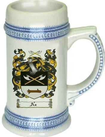 Ax Family Crest Stein / Coat of Arms Beer Tankard. We believe our Coat of Arms Steins are of the highest quality anywhere. The glassware quality is very thick and sturdy. The stein feels great in your hand with a very thick handle. Fill this glass with your favorite beer or beverage. keywords: steins, beer, german, glass, glassware, cup, tankard, goblet, family shields, shield, family, genealogy, heraldry, code of arms