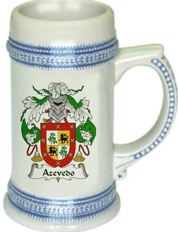 Azevedo Family Crest Stein / Coat of Arms Beer Tankard. We believe our Coat of Arms Steins are of the highest quality anywhere. The glassware quality is very thick and sturdy. The stein feels great in your hand with a very thick handle. Fill this glass with your favorite beer or beverage. keywords: steins, beer, german, glass, glassware, cup, tankard, goblet, family shields, shield, family, genealogy, heraldry, code of arms